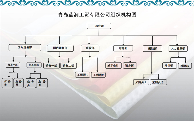 青岛蓝润集团成立于2008年,主要致力于创建企业集团。集团旗下的许多子公司,如青岛富利尔有限公司。青岛蓝润工贸有限公司,青岛同祥春工贸有限公司等一批商业公司将开展国内外贸易,本公司是一家合资企业与进出口贸易、工贸一体化是一家多元化的大型企业。公司座落于著名的青岛奥运帆船之都,距港口20公里,距国际机场10公里,地理优势明显,开发了多种配套设施。企业拥有进出口经营权,拥有专业的管理和全方位的服务机构,立足本地资源,开拓国外市场,产品远销欧洲、中东、非洲、南美、东南亚等60多个国家。质量和诚信为公司赢得了世界各地的良好声誉。公司以“精益求精、锐意创新、成长共赢”的企业理念,“永续发展、实现价值、探索未来”,全力以赴为客户提供全面优质的服务。 公司将继续努力,恪守竭尽全力,真诚为客户服务的宗旨,不断探索市场,与广大同仁携手共进,共创辉煌。